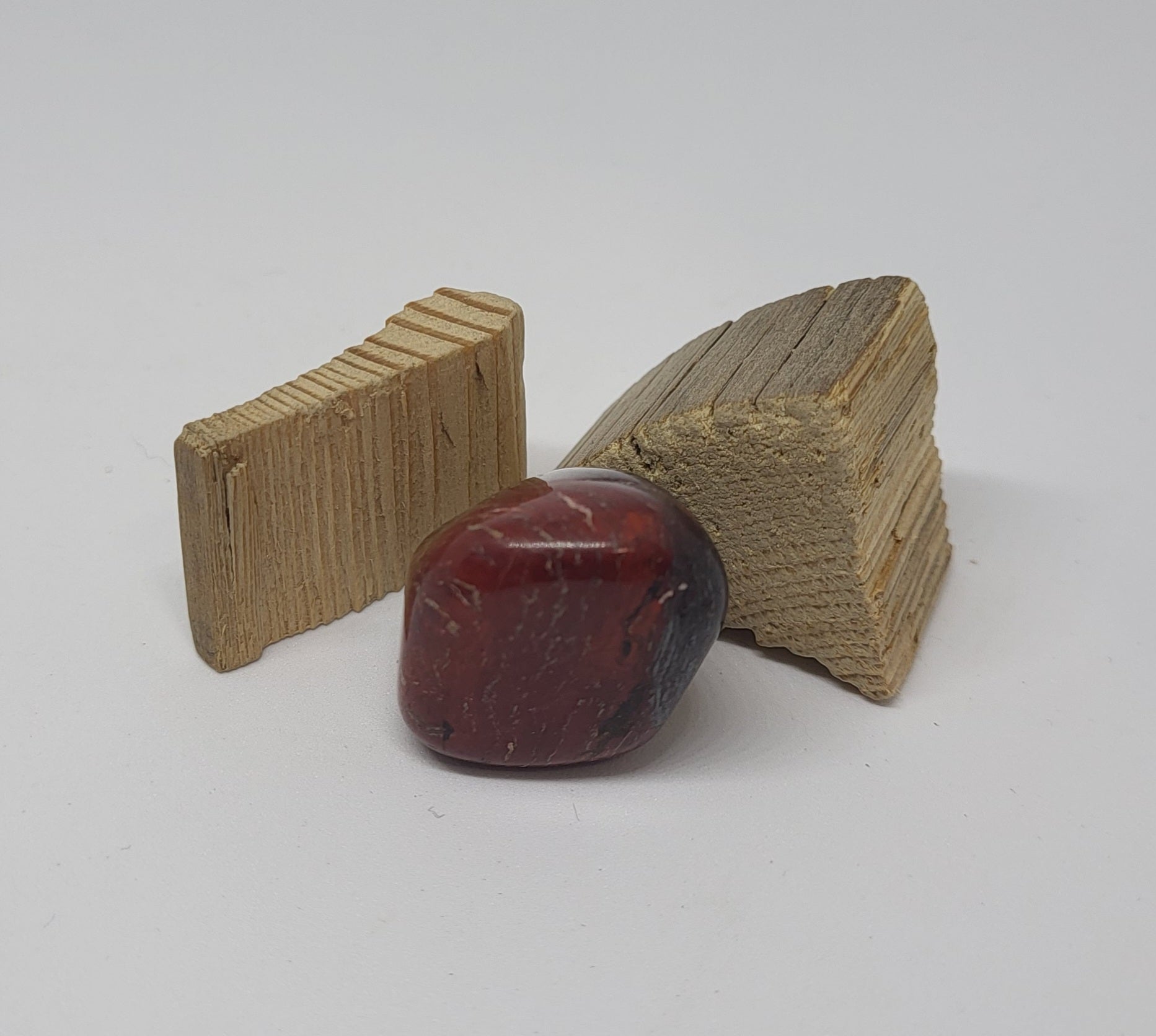 Included with a luxurious velvet bag is a precious Red Petrified Wood crystal and a small surprise gift. This crystal is thought to remind wearers of the presence of the earth, enabling them to connect more deeply with themselves to find inner peach