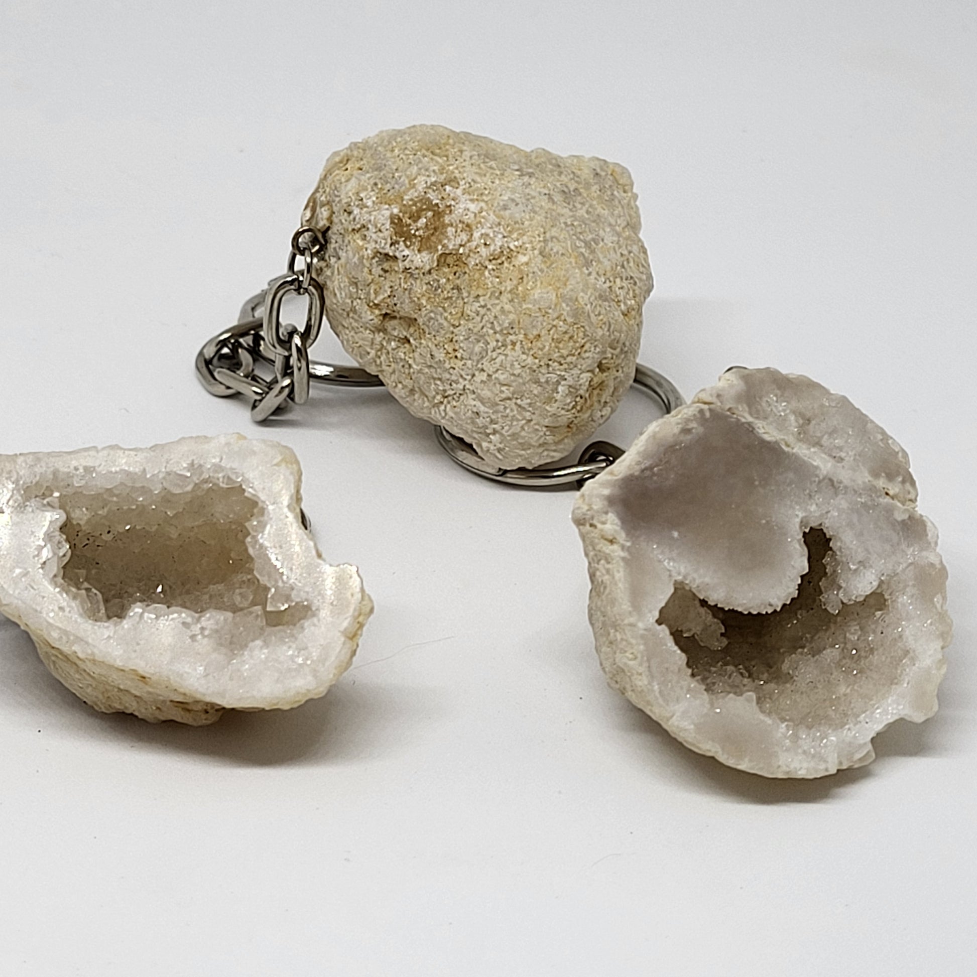 Carry a piece of natural beauty with you wherever you go with our Quartz Geode keychain. The sparkling, shiny quartz adds a touch of elegance to your everyday routine. This pretty keychain is not only functional, but also serves as a reminder of the wonders of nature. It is believed quartz has positive and soothing energy.