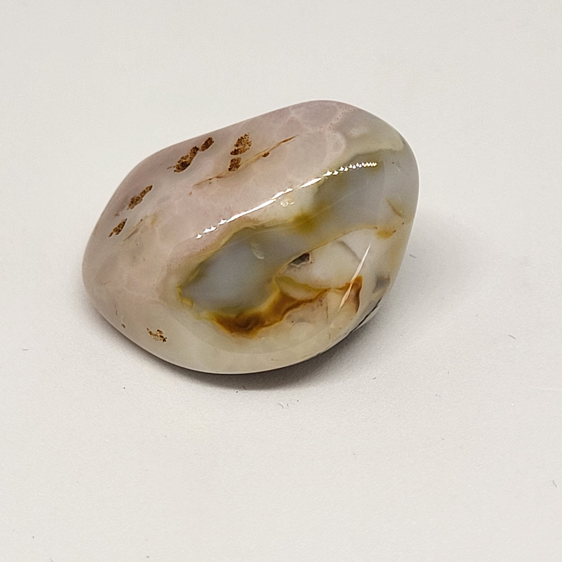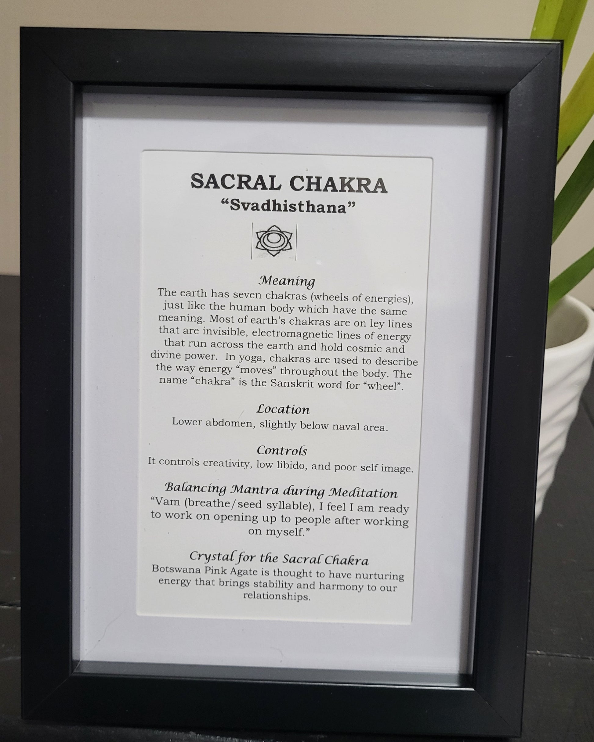 The location of the Sacral chakra is located in the lower abdomen, slightly below the naval area which controls creativity, low libido, and poor self image. The Botswana Pink Agate crystal is thought to have nurturing energy that brings stability and harmony to our relationships.